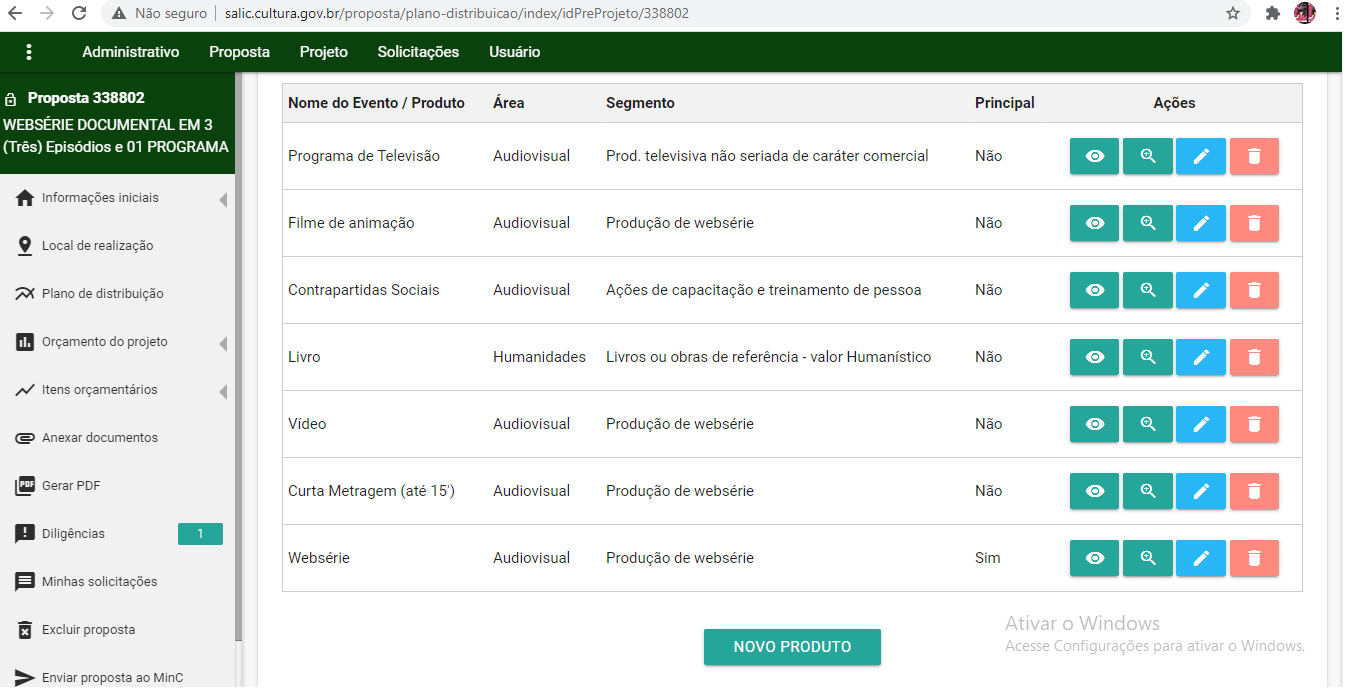 - Excluir o Produto "Sítio de internet" e inserir seus custos na Divulgação.